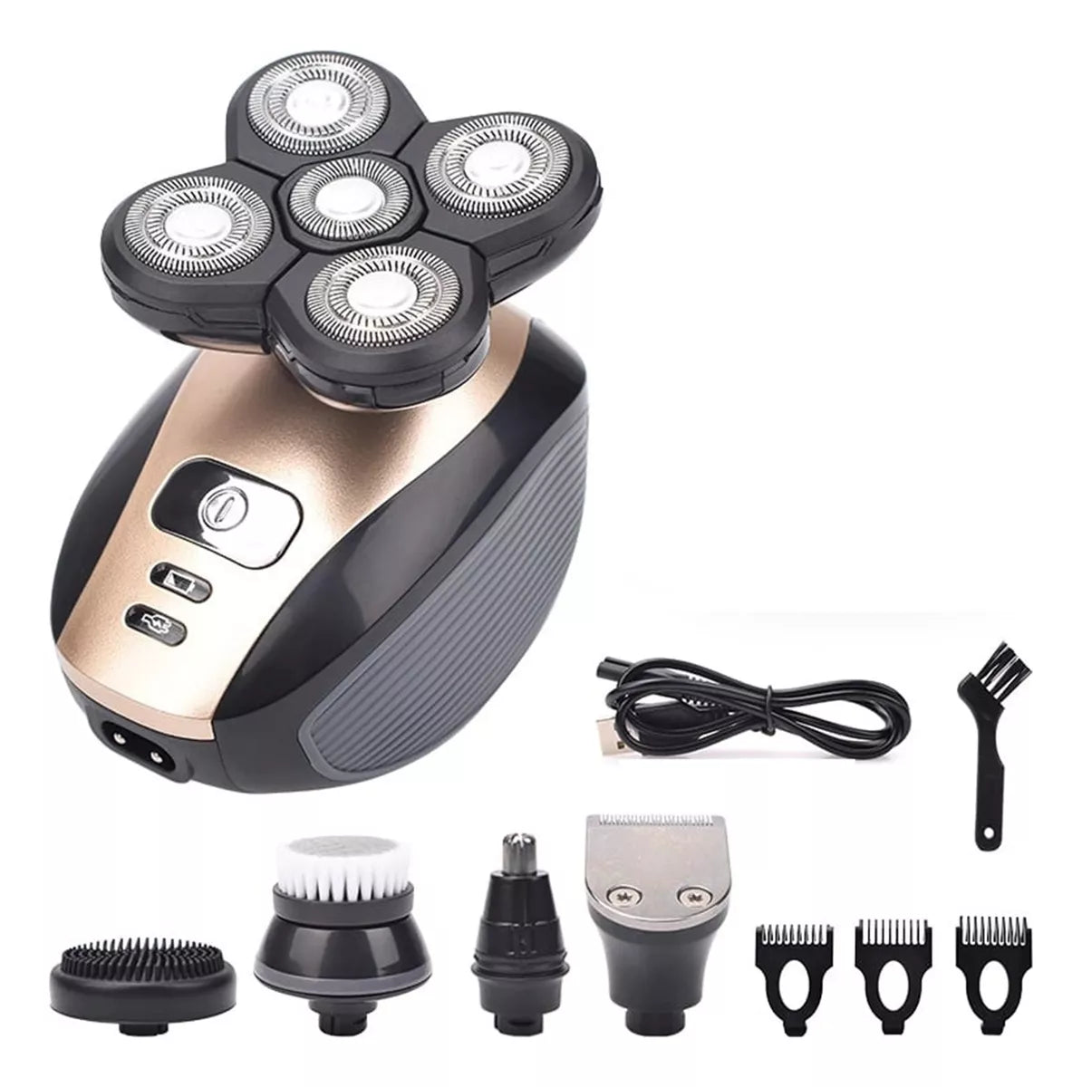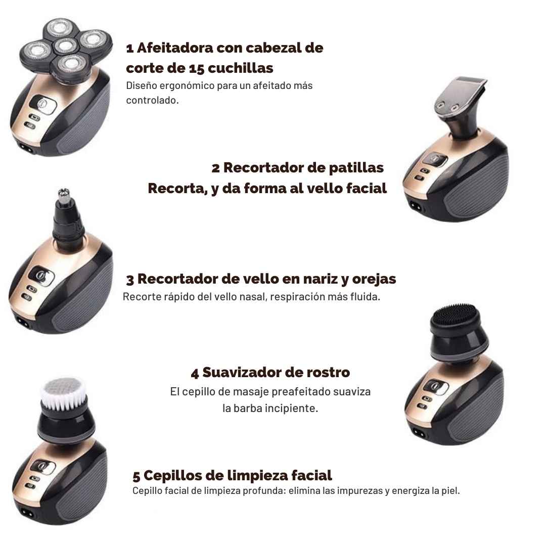 - Cabezas Intercambiables: Cortadora de barba, cortadora de precisión, cortadora de vello nasal, cepillo exfoliante y cepillo limpiador.